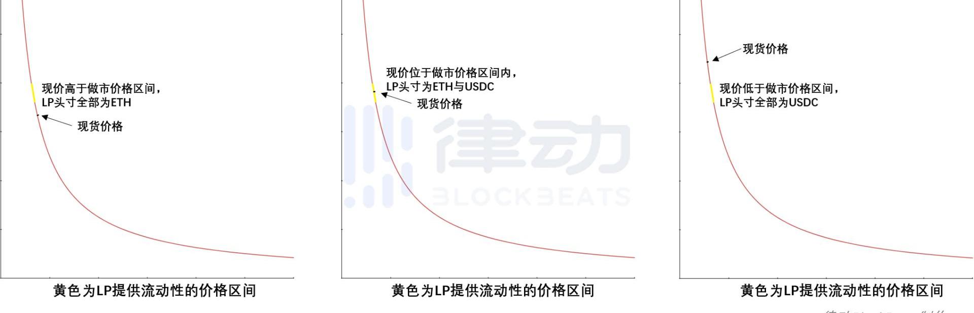 假設ETH現貨價格為2000美元,LP在2300-2310美元的范圍內,全部以ETH提供流動性。那么當ETH價格上漲到2300美元時,LP提供的ETH開始被逐漸兌換為USDC。若此后ETH的價格繼續上漲,LP資產中的USDC比例便會不斷升高,直到現貨價格達到2310美元時,資產被全部兌換為USDC。