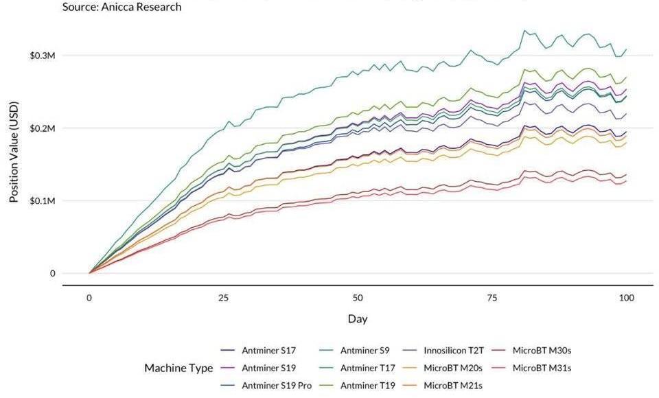 考慮到牛市的強度,即使是每天出清比利幣的礦工,在運行S9礦機的情況下,也能在100天的模擬期內實現盈虧平衡。S19礦機的利潤要低得多,但仍能在每天出售的同時收回大部分初始投資。