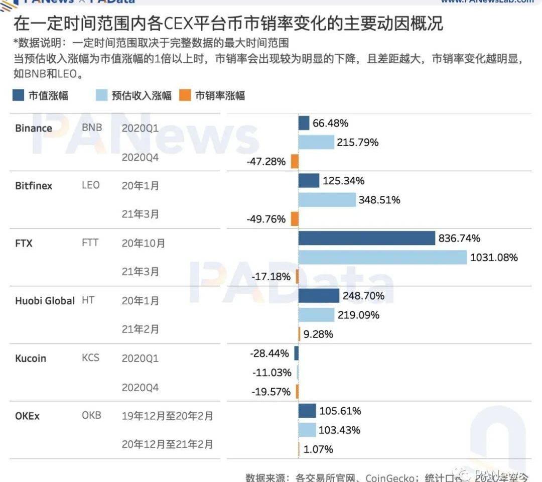 如果在一段數據完整的時間段內來觀察CEX市銷率變化的影響因素,可以發現,市值與預期收入的變化對市銷率估值有影響,但敏感性不高。當預估收入漲幅為市值漲幅的3倍以上時,市銷率會出現較為明顯的下降,比如BNB和LEO,此時兩者的市銷率下降近50%,市場看到了其被低估。若預估收入漲幅不到市值漲幅的1倍,無論此時市值和預期收入是正增長還是負增長狀態,平臺幣的估值跌幅只有不到20%。
