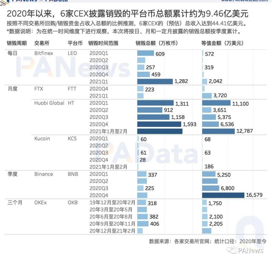 考慮到數據的完整性,按照去年的回購/銷毀情況來觀察各家CEX的實際營收情況,可以發現,Binance回購/銷毀的平臺幣總額最高,約為3.47萬美元,相當于營利了17.34億美元。其次,Huobi回購/銷毀的平臺幣也達到了2.67億美元,相當于營收了13.33億美元。而OKEx、Bitfinex和Kucoin的營利則分別約為3.25億美元、1.95億美元和2407.98萬美元。