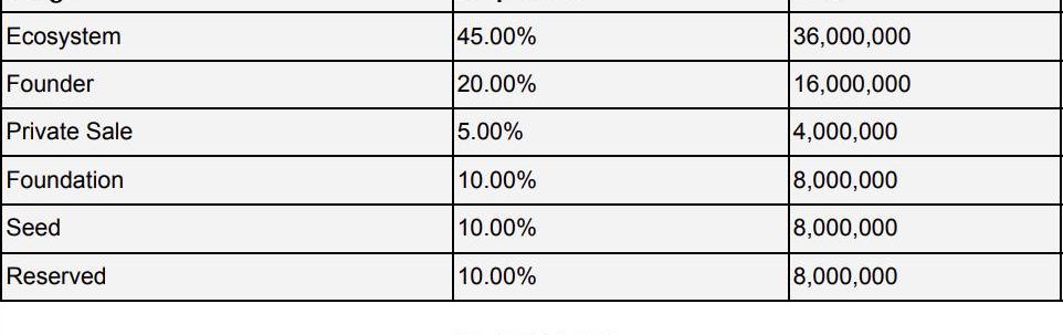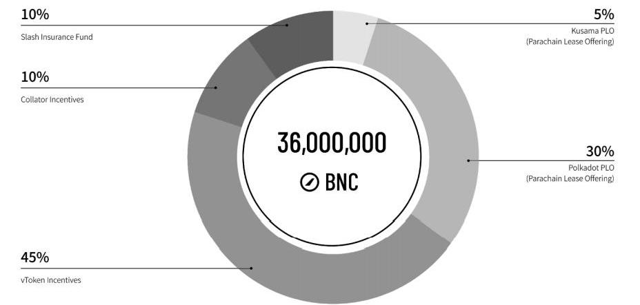 2.2.1發行總量8000萬,其中1620萬作為vToken持幣激勵,激勵期限為10年,每兩年產量減半,15.75%的BNC用于Polkadot和Kusama的競拍獎勵,具體分配情況如下: