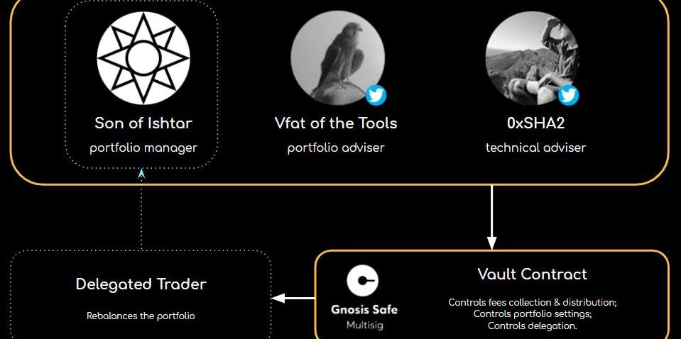 Vfat和0xSHA2代表構建DAO的利益。他們將對投資機會和風險提出建議,并對投資組合經理的決策進行全面檢查。投資組合保險庫的地址控制著交易的委托、收取費用和更改雜項設置,Gnosis多簽保險箱將放置三分之二的私鑰。