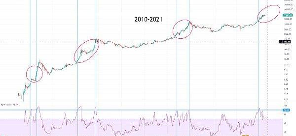 上圖為BTC2010-2020目前長期周線走勢,副圖指標是對應長期RSI走勢曲線,研究可以看出,在BTC歷史上前三輪牛市中,2011年、2013年和2017年三次牛市,每一輪牛市,隨著價格一路向上,周線RSI都有拉升超過警戒線數值90上方兩次的機會。