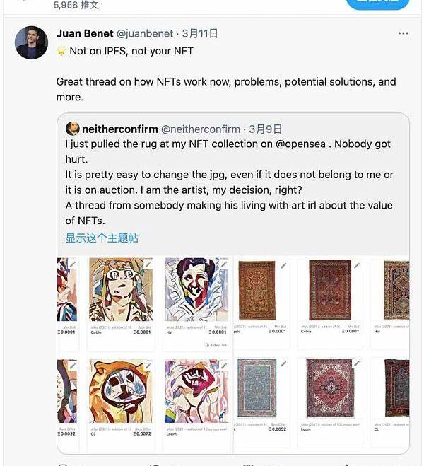 IPFS創始人JuanBenet的推文“NotonIPFS,notyourNFT”