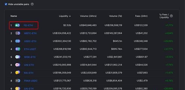 PCV的存在決定了這個穩定幣項目的創世啟動方式。在募集63.9萬枚ETH后,FeiProtocol鑄造了等價值的FEI,將它們加入到UniswapFEI-ETH流動性池內。創世結束后,FEI-ETH交易對就以超25億美元的流動性,位居Uniswap所有交易對的首位。