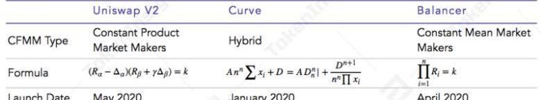 Balancer通過實施恒定函數算法,推出兩個以上的資產以及權重在50%/50%之外的方法。Curve于2020年初推出,它修改了Uniswap的AMM功能,以最大程度地降低價格相對穩定資產的滑點,這表明對CFMM曲線的細微調整可以大大提高資本效率和降低滑點。