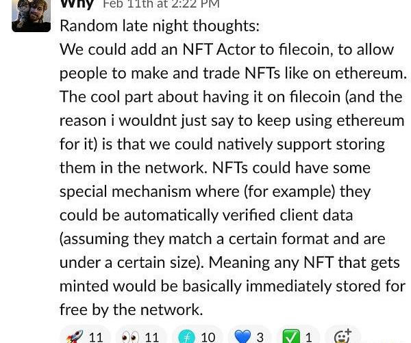 Filecoin創始人胡安此前曾發推稱:“不在IPFS上的NFT,不是你的NFT。”核心開發者Why則在Slack頻道發布關于將NFT添加到Filecoin網絡的想法,引發社區熱議。