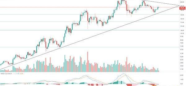 小幅度震蕩消化前期放量拉升陽線,大方向多頭趨勢未變,短線支撐111美金,強支撐94美金,不破可持有,有效突破140美金,下一阻力175美金,那么后面就有望挑戰歷史頂點220一帶強壓。