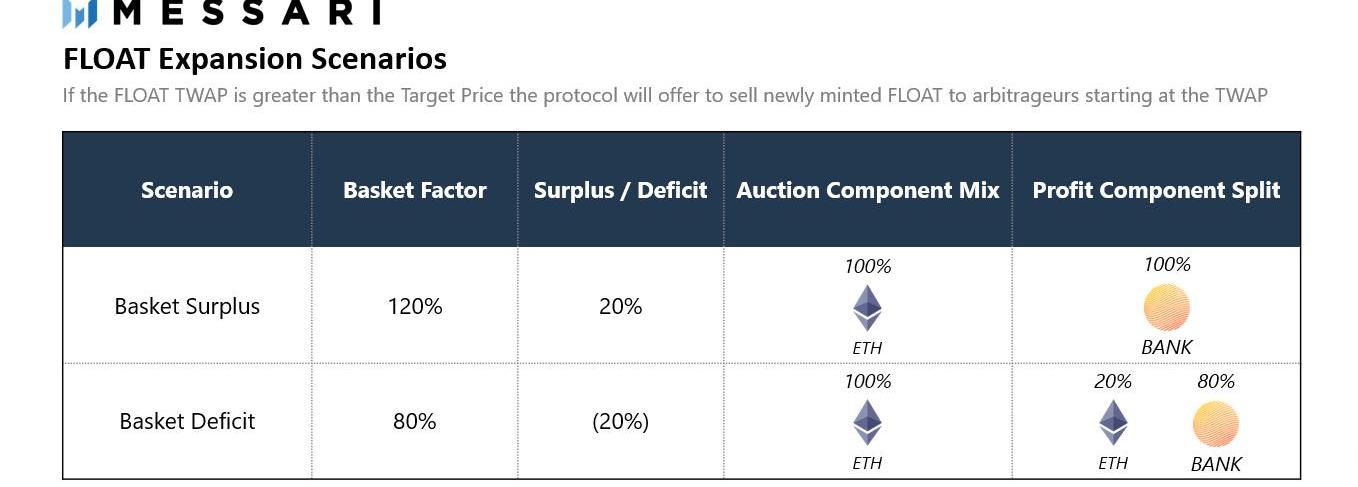 為了購買拍賣中的FLOAT,套利者需要以ETH和BANK混合支付費用。如果BasketFactor達到100%的目標,那么協議將把目標價格設為ETH的價格,把當前拍賣價格和目標價格之間的差額設為BANK的價格。差額支付的BANK被認為是擴張和燃燒的利潤,減少BANK的供給。拍賣者支付的ETH會放入籃子里,收到的BANK有一小部分將分配給社區金庫。