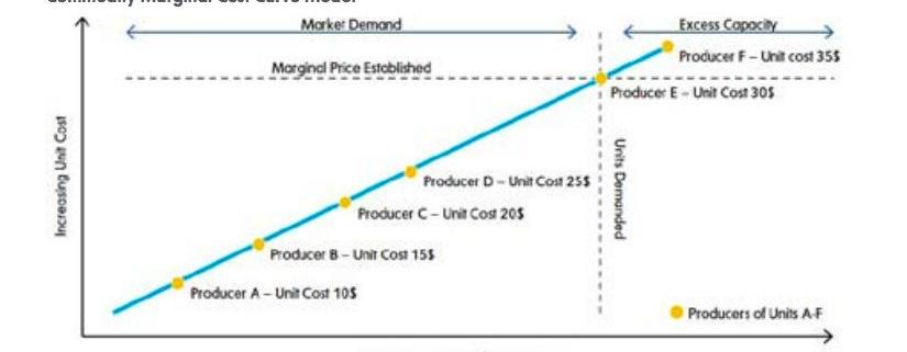 大宗商品通過供給/需求和邊際成本曲線框架進行估值。在下一頁的圖表中,假設對這種假想商品的需求位于需求單位線上。商品成本理論規定,成本最低的生產商將首先供應需求,然后是成本較高的生產商,直到市場需求得到滿足。