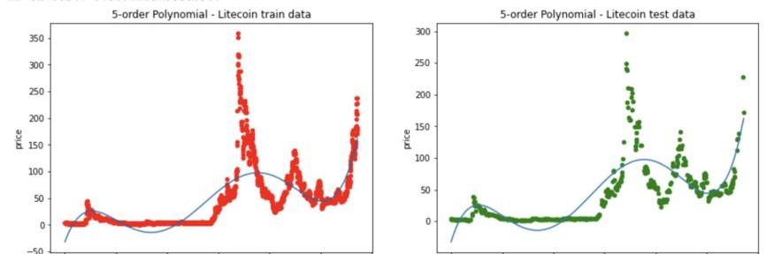 我對Litecoin的歷史價格進行了簡單的多項式回歸,使用5、25和80的階數。在每種情況下,R2值將提供一些關于模型在測試數據集上的擬合度好壞的信息。