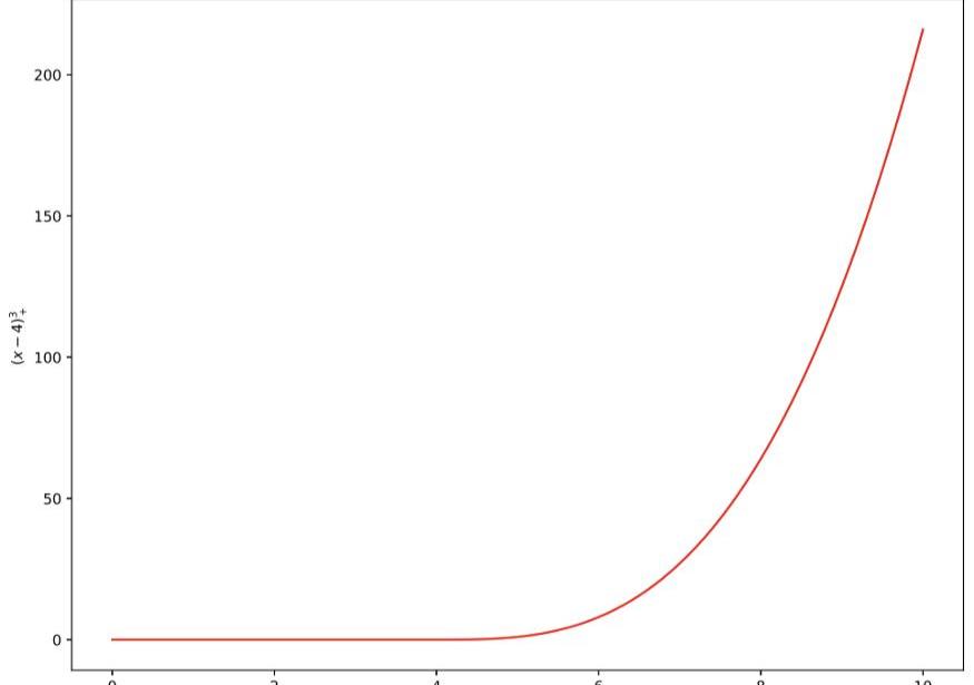 樣條的一個例子是下面的截斷線性函數。它在4的左邊是平的,稱為函數的結。
