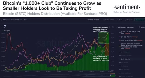 根據分析平臺的數據,即使價格超過其歷史最高點,擁有1000個或更多BTC的比特幣持有者的數量仍在繼續增加。與此同時,不到1000枚比特幣的地址量出現了下降,因為小型HODLers被猜測正在當前加密貨幣的價格中兌現利潤,而不是更高的預期和價格水平。