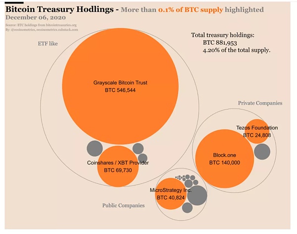 現在,根據所附圖表顯示,在12月6日,幾乎沒有實體持有BTC供應量的4.20%,也就是總計超過881,953個的 BTC。但是,此后此數字有可能增加,截至發稿后,或許可能攀升至接近5-6%。