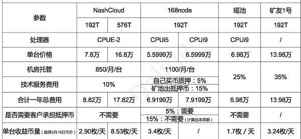 從基本參數來看,168node、瑤池礦機和礦友1號所用的處理器皆為家用辦公級別的處理器,而NashCloud用的是服務器級別的處理器。從這方面看NashCloud在礦機穩定性方面比較有優勢。