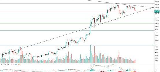 聯動調整,力度相對較大,不過日線仍是三角形內運行,趨勢線目前支撐在160美金附近,調整量能和前期比也是相對縮量,不破三角支撐線不能判定這波趨勢的終結。