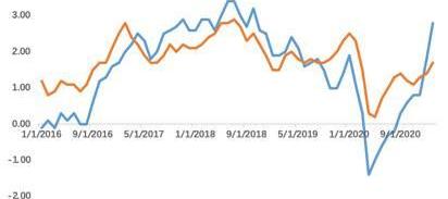 2020年4月至8月上旬,10Y美債的收益率維持在0.5-0.7%的低水位平穩運行,從8月中旬到1月底,美債收益率開啟上行趨勢。從1月底至今,美國的通脹率保持穩定的趨勢,因此,美債收益率的上漲主要是由實際收益率導致的。如今,美債收益率已超過1.5%,引起金融市場對通脹的擔憂。