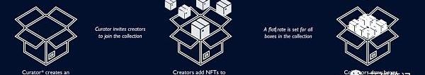 從BlindBoxes的流程看,加密創作者專心負責創作,加密策劃人負責策劃主題和盲盒整理,而傭金的收益則驅動策劃人的努力。這一流程跟NFT名人Pranksy的NFTBoxes相比,Pranksy本身就是一位策劃人,也是一位收藏者。而BindBoxes則將更多的策劃人添加到市場中來。