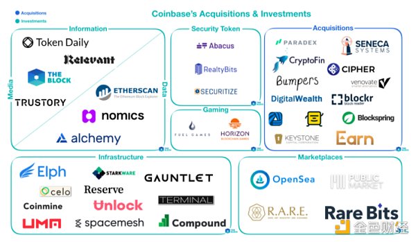 Coinbase由前Airbnb工程師Brian Armstrong和前高盛交易員Fred Ehrsam于2012年創立。目前其不僅發展成為美國最大的加密貨幣交易所,還投資了眾多加密貨幣公司,擁有龐大的生態系統。下圖為TheBlock總結的Coinbase部分投資布局。