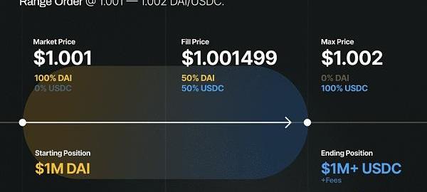 比如,如果當前DAI的價格低于1.001USDC,那么Alice可以設置在1.001-1.002DAI/USDC的區間內掛單100萬美元的DAI,即當DAI的價格在該區間時,協議自動開始將100萬美元的DAI兌換成USDC。