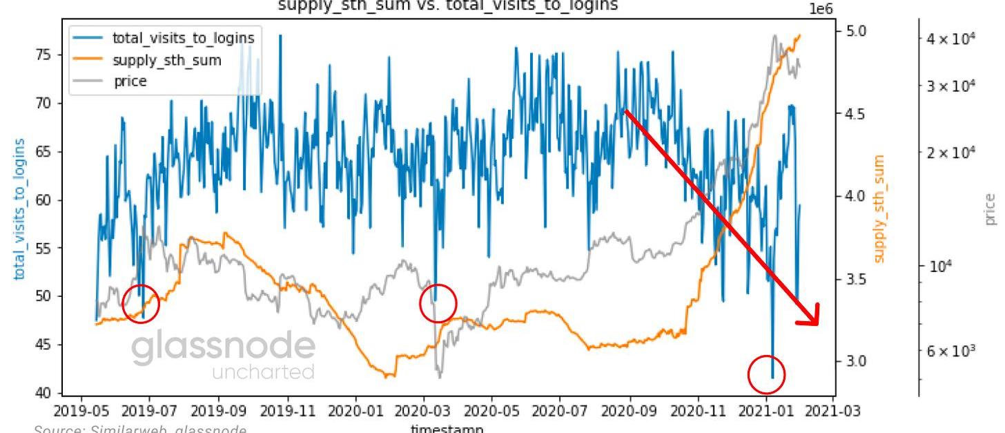 在下圖,您可以看到主要交易所和網關登錄與注冊的比率。最近幾周,該比率已進入與2019年大部分牛市時期相同的區間。這意味著自2021年初以來,交易活動的增加主要是來自已經擁有賬戶的投資者而不是新加入的投資者。