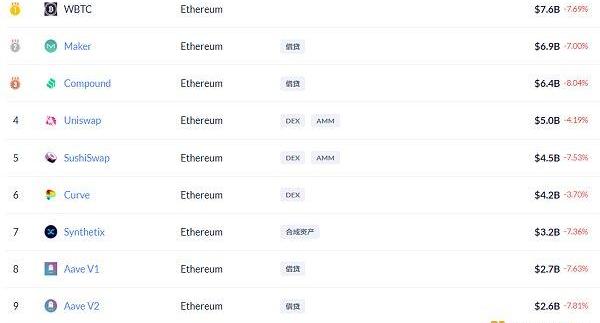 DeFi項目鎖定資產前十排名及鎖倉量,數據來源:Debank