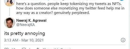 不僅如此,一些加密行業大咖的推文也被人利用并制作NFT拍賣,其中就包括CoinShares的MeltemDemirors和CoinCenter的NeerajAgrawal: