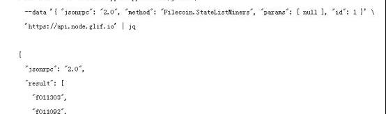 您可以通過JSONRPCAPI查詢已同步的節點,列出所有當前活躍的礦工(為了測試目的,使用了公共終端節點,使用Filecoin.StateListMiners方法。