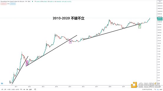 回看BTC 2011年至2020年長期周線走勢,歷史上曾有過兩次經典的不破不立案例。第一次是2011年9月,BTC周線跌破上行趨勢線,價格從跌破點5.3美元一路砸至2美元附近,區間跌幅高達62%,而后價格便迎來強力反彈行情,僅用不到兩個月的時間便回升至跌破點5.3美元上方,后面價格回踩下,便開啟了2012-2013年的牛市行情,而此次的不破不立的低點2美元也成為BTC這一輪牛市行情起漲的最低點。此后2年,BTC維持震蕩上行走勢,直至2013年見頂1177美元,兩年內最大漲幅高達545倍。
