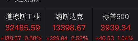 美股三大股指早盤高開高走,最終集體收漲。道指收漲188.57點,漲幅0.58%,報32485.59點,連續第二日創收盤新高。標普500收漲1.04%,報3939.04點,創收盤新高。納指收漲2.52%,報12298.67點,創3月1日以來收盤新高。