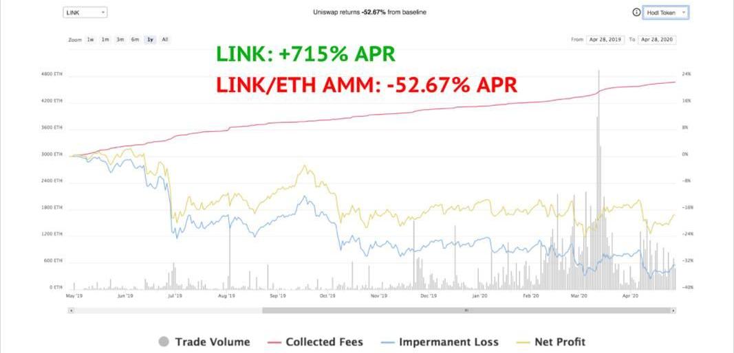 這對有限合伙人的長期生存能力尤其重要,因為投資回報有時會超過掉期費用的利潤。以Chainlink的代幣為例,它的價格在2019年4月至2020年期間價值上漲700%,導致LINK/ETH對上的流動性提供者與分別持有這兩種資產相比,價值相對損失超過了50%。