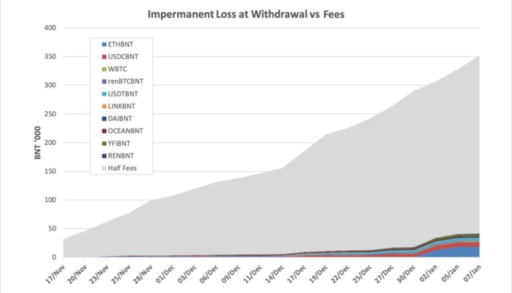從2020年11月至2021年1月期間的協議活動來看,協議每賺1美元,只有0.07美元的無償損失補償。請注意,這里匯總了協議中所有的無償損失保險成本和互換費用的收入,有效地分散了所有流動性池中的無償損失風險。這導致了協議為參與Bancor生態系統的所有有限合伙人提供可持續的無償損失保險。