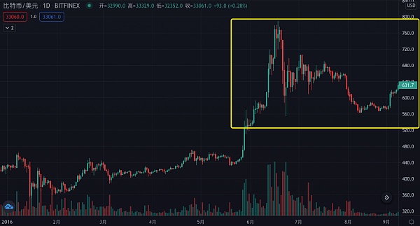 隨著后續利差開始回升,比特幣的避險屬性會更著重顯現。目前,比特幣牛市先于黃金牛市,比特幣的避險屬性來自于外匯擠兌,黃金的避險屬性來自于信用對沖。短期來看需要注意技術性回調,下圖是 2015--2016 年比特幣的走勢,需注意擁擠交易后的多頭平倉帶來的大幅回調。