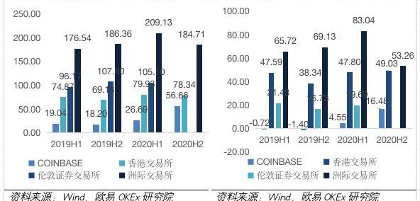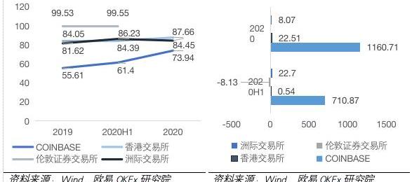 在凈利潤方面,隨著加密數字貨幣的大放異彩,各大加密市場交易所交易量迅速攀升,Coinbase在2020年首次實現盈利,并且從上半年的0.45億元迅速增長262.48%至年末的1.65億元,香港交易所、洲際交易所2020年半年僅增長了2.57%、-35.86%。