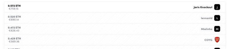 除了定向競拍某張卡片之外,玩家還可以直接打包競拍一些隊伍主題卡包,競拍成功后可直接獲取卡包內的全部五張收藏卡。不過,卡包的競拍價格一般都要貴于單張球星卡,且卡包內的組合是由官方決定,搭配著一兩張高人氣卡出售的其他卡片有時會稍顯吸引力不足。如上圖所示,這組已被叫到了0.312ETH的卡包已收到了24份競拍,但可能大多數玩家都是沖著薩拉赫去的。?