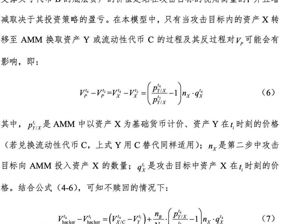 第三步,套利。攻擊者將步驟二中的資產Y投入AMM資產池,以抬高后的價格獲得資產X或流動性代幣C。需要說明的是,第二、三步中的操作對應于swap或流動性挖礦。對于三個及以上幣種的AMM,這里的X或Y可視為資產組合。