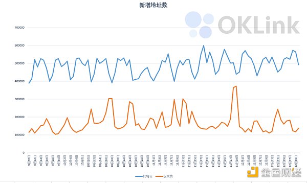 比特幣鏈上新增地址數為367.77萬,環比上升1.16%,同期以太坊鏈上新增地址數為108.19萬,環比上升3.12%。