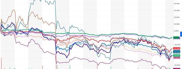 進入三月以來的短短幾天,美股市場持續低迷走勢,而實際上這種下跌趨勢對于一些股票來講,已經持續了將近一個月。截止發文,在過去一個月,在疫情期間領跑的科技股Apple和Amazon股價大幅走低,而對于波動更大的新能源汽車板塊,似乎更是處于“泡沫”破碎的邊緣,特斯拉在過去一個月股價下降了30%,中概股蔚來,小鵬和理想也都大幅下跌。但由于近期加密市場的集體下行,比特幣以太坊從高點墜落,一些“比特幣概念股”和“區塊鏈概念股”的跌幅更大。價值投資比特幣的龍頭公司MicroStrategy?(MSTR)的股價自最高點下跌了50%,數字貨幣挖礦公司如500.com,MarathonPatentGroup(MARA:-37%),RiotBlockchain,以及第九城市等上市公司股價也都自最高點斷崖式下跌。