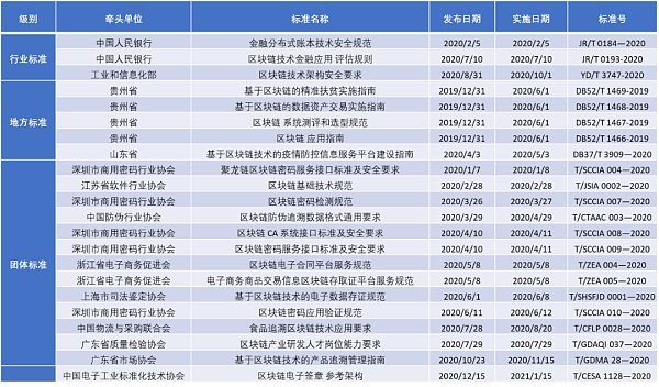 根據全國標準信息公共服務平臺(http://std.samr.gov.cn/)公布的信息,截至2020年12月,已發布區塊鏈/分布式賬本技術國家標準0項、行業標準3項、省級地方標準5項、團體標準34項。雖未正式發布任何一項國家標準,但有3項正在加緊起草中,涉及參考架構、智能合約和存證。而這三個方面也是區塊鏈的發展基礎和當前主要應用方向。
