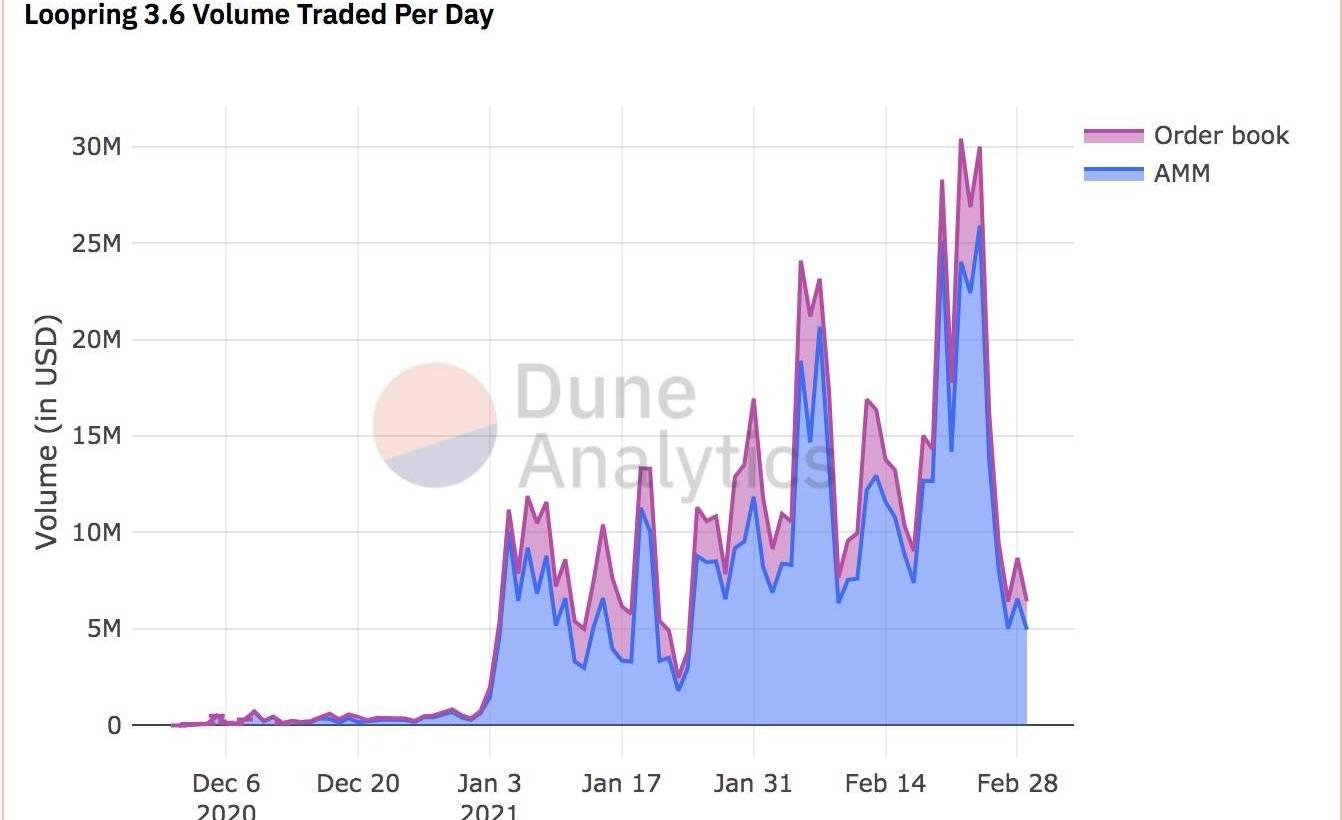 而近期LoopringDEX的每日交易量大約在800萬美元-3000萬美元之間,其中AMM類型交易額遠超訂單簿類型交易。