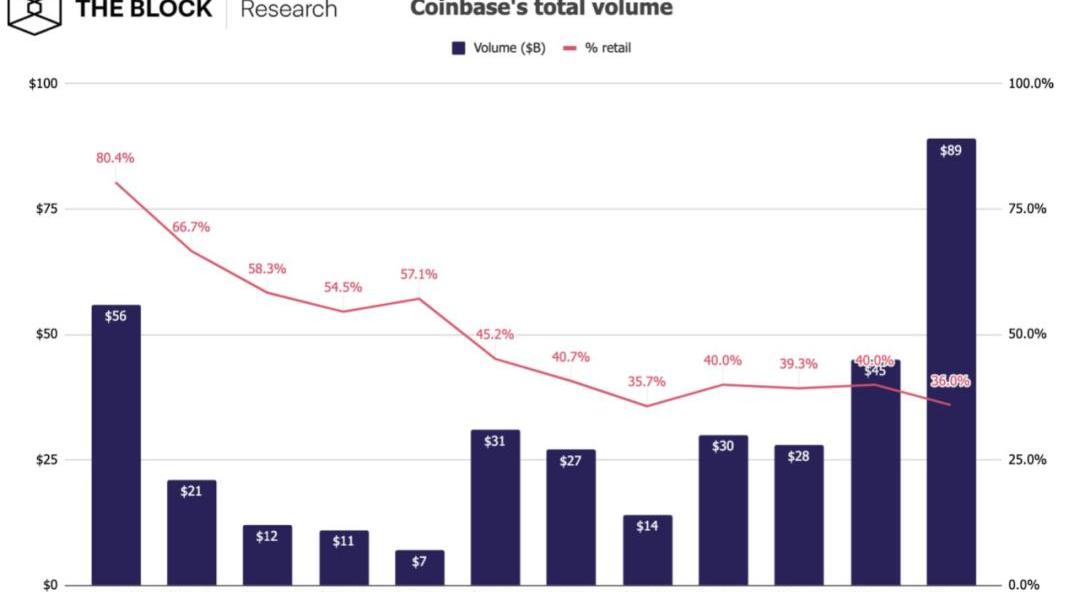 值得注意的是,Coinbase數據顯示,在2020年第四季度交易量中,零售用戶交易量占比為36%,機構用戶占比為64%。而在2018年第一季度的交易量中,零售用戶交易量占比為80%,機構用戶占比僅為20%。這個數據與2020年加密市場熱潮由機構交易者主導的主流說法相吻合。