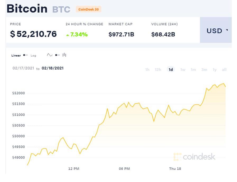 在隔夜重回50000美元上方之后,比特幣價格漲勢延續,最高站上5.26萬美元,較日內低位漲超3000美元。截至目前,比特幣報52210.76美元,24小時漲幅超過7%。