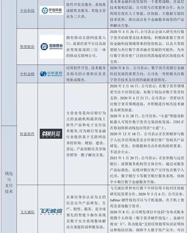 但是圖2-1所示產業圖景并不完善,根據上文的分析,在數字人民幣的研究推廣過程中還需要支付終端、安全保障等多個功能模塊的構建,這就涉及到數字人民幣背后不直接對接公眾的產業鏈條。為進一步挖掘數字人民幣產業鏈參與方,我們梳理了互動易、上證易平臺上各公司針對數字貨幣的3000余條回復,發現至少54家上市企業都公開表達了參與的意向或公布了相關研究的進展。總的來看,可大致分為監管技術、安全技術、銀行科技、錢包與支付技術、傳統設備改造和對接支付場景六類企業。