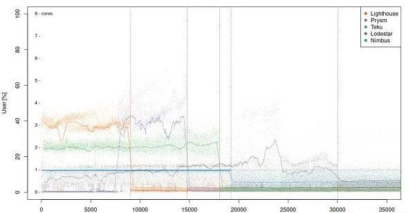 最后但同樣重要的一點是,讓我們看一下CPU的利用率。在上面圖表中可以看到客戶端之間的一些有趣差異。