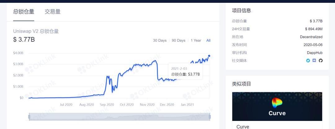 以Uniswap、Sushiswap為代表的DEX,近日無論是鏈上數據還是幣價都令人興奮。根據OKLink鏈上數據,截止發稿日,UniswapV2總鎖倉量仍在高速增長,今日創下了37.7億美金的歷史新高;在幣價方面,代幣UNI發稿時也同步達到19.473美金的歷史新高,是去年年底的5倍左右。坐在DEX第二把交椅的Sushiswap,代幣幣價也從去年年底的2.5美金一路上漲,在今天創下了13.694美金的新高。