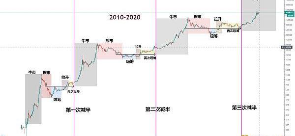 上圖為BTC?2010-2020年這10年周期的長期周線走勢,目前BTC已經完成了三次獎勵減半,我們從圖中可以發現,每一輪減半周期時間內,BTC走勢都包括大牛市、熊市、底部區間吸籌、小牛拉升階段、觸頂回路再次吸籌階段以及之后的新一輪牛市行情的開始,這在BTC2010-2013年第一次減半周期、2013-2016年第二次減半周期和2016-2020年第三次減半周期均得到驗證,歷史不會簡單重復,但總是驚人相似,但BTC市場的規律特色一直沒有改變,只是每個不同時期這些具體的特點稍有細微變化而已。