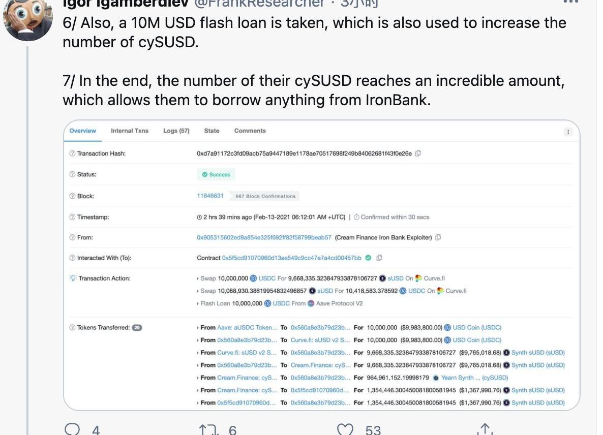 2.他們通過兩次交易來完成此操作,每次借出資金并還給IronBank,同時接收cySUSD。