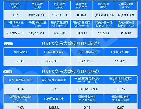 截至2月1日10:30,根據OKEx交易大數據,BTC合約多空持倉人數比為1.17,市場做多人數占據優勢;季度合約基差在800美元上方,永續合約資金費率為正,交割及永續合約持倉總量為18.3億美元,總體上多軍占優;BTC交割及永續合約精英持倉方面,做空賬戶比為51%占據優勢,精英賬戶多頭持倉23.53%,精英賬戶多頭占優,繼續關注大戶持倉變化。從期權合約數據來看,看漲/看跌主動買入量比為0.46,看漲/看跌主動賣出量比為0.67,主動看漲看跌賣出量占據優勢。