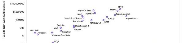 雖然硬件和軟件的進步使得AI的培訓費用呈每年下降37%的趨勢,但是AI的市場體量增長的更快,達到了每年10倍。結果就是,AI的總訓練費用不斷增加,遠遠超過了源自硬件、軟件進步所節約的成本。ARK認為,最先進的AI訓練模型的成本很有可能增加100倍,從目前的大約100萬美元提高到2025年1億美元以上。
