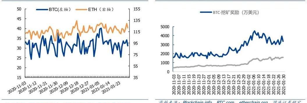 上周BTC全網挖礦難度為20.82T,環比上升1.0%;下次難度調整日在2021年2月6日,預計難度值為21.90T(+0.36%);上周ETH全網平均挖礦難度為4.46T,環比上升5.2%。
